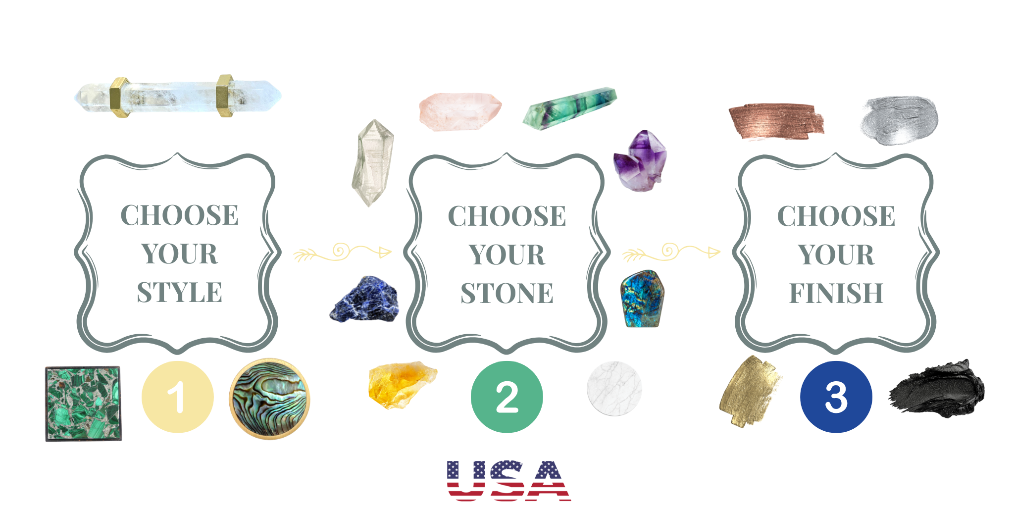 Crafted in the USA with solid brass and hand-selected, jewelry-grade gemstones, each piece elevates your kitchen, bathroom, bedroom, or living room into a haven of elegance and emotion.