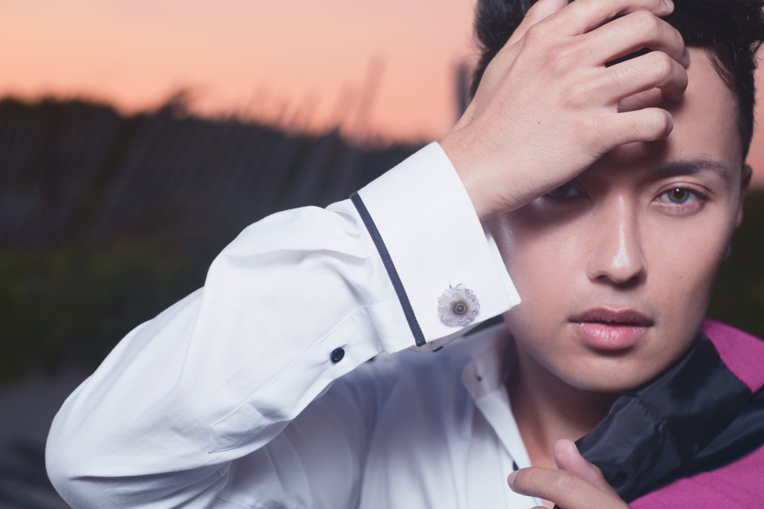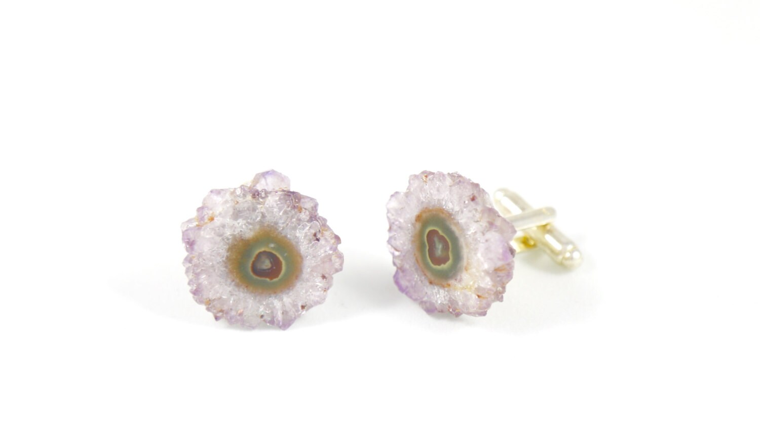 Amethyst Stalactite Cufflinks featured on musician Paul! Explore your creative side with these beautiful crystal cufflinks. Amethyst Stalactite is the stone of self-expansion as the core of agate blossoms into gorgeous purple pointed crystals that resemble a flower!