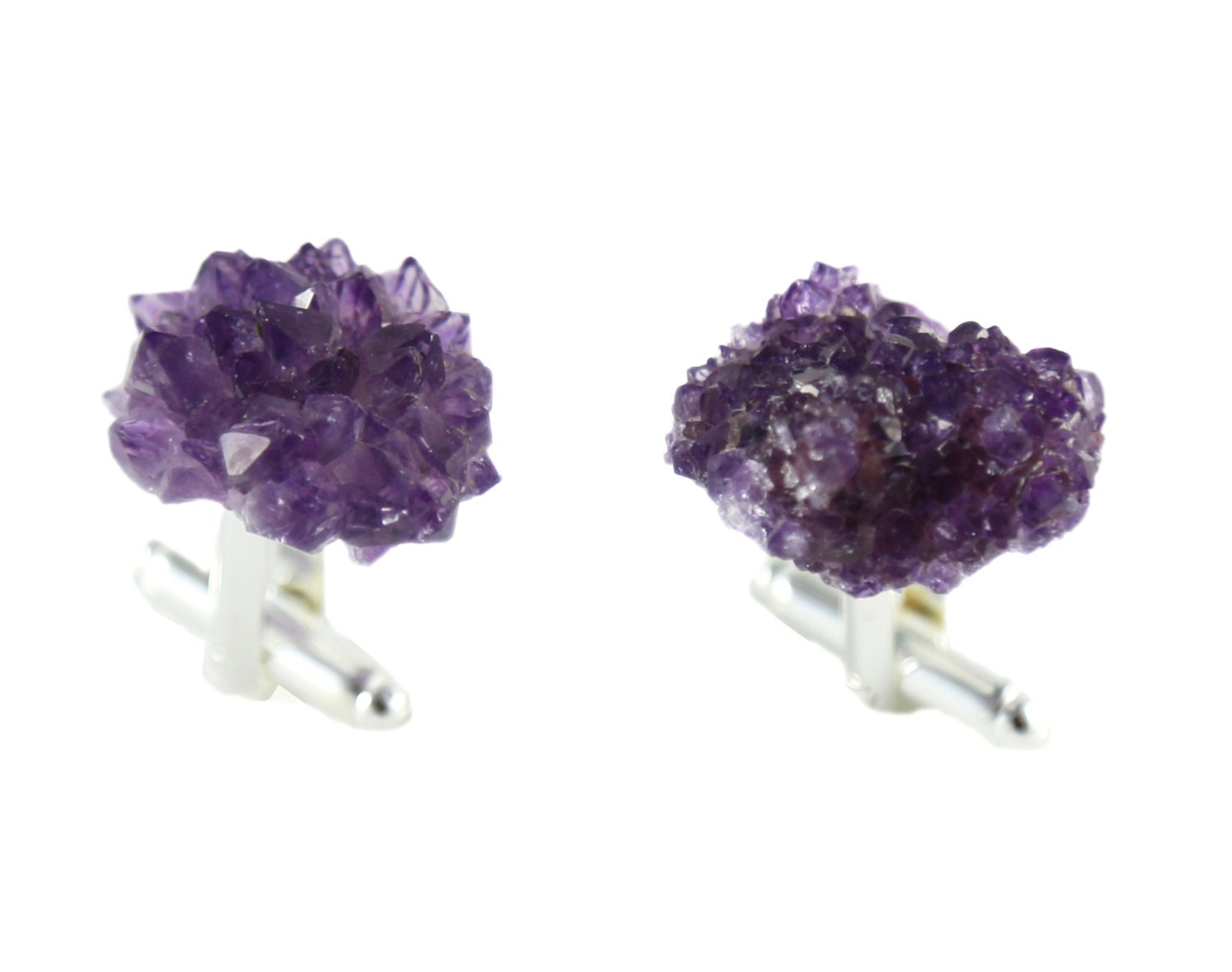 These purple crystal cufflinks have crystals that resemble blossoming flowers. Our amethyst cufflinks come ready for gift giving in a jewelry box.