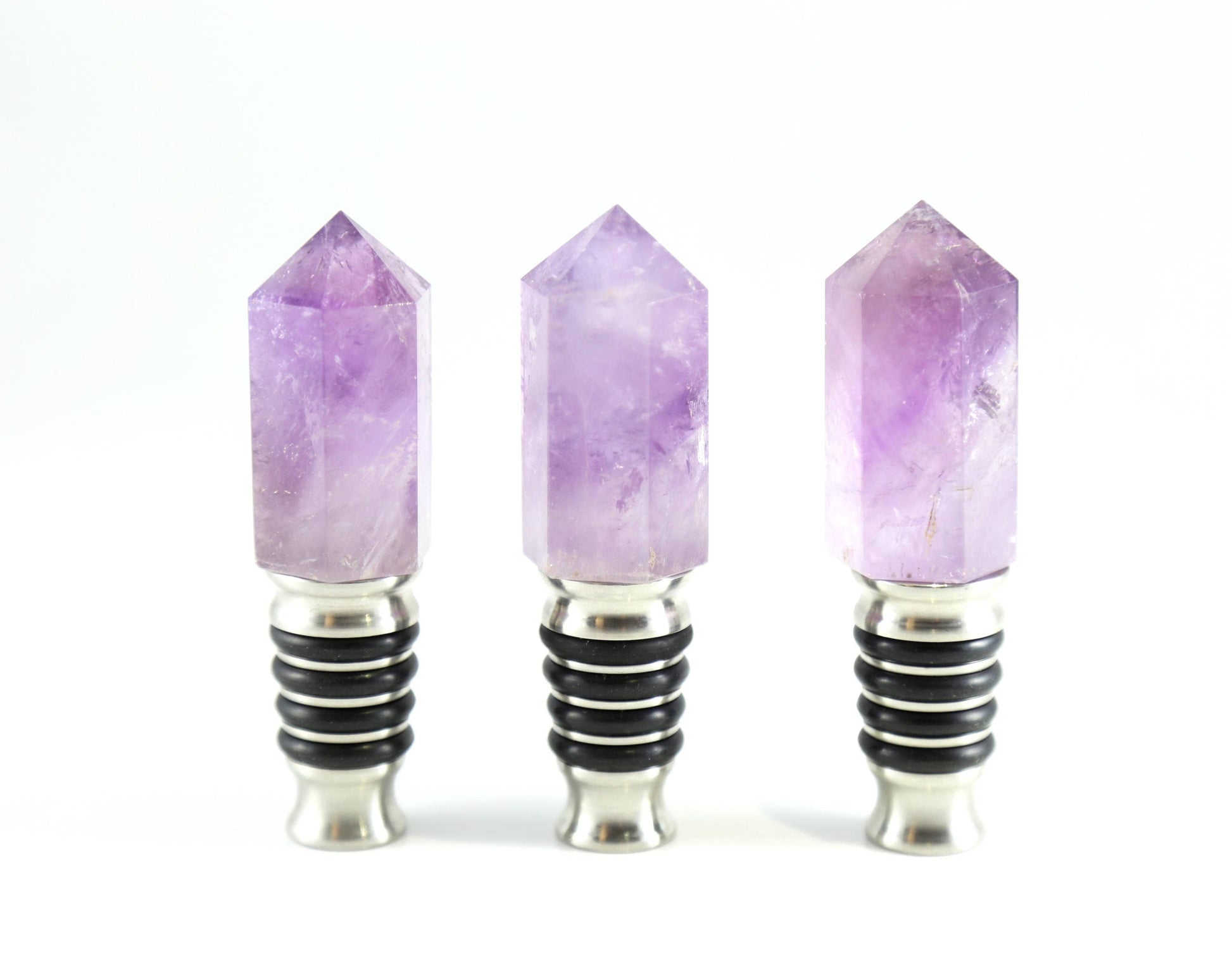 This amethyst wine stopper will brighten your table with its beautiful, energizing purple color. Use this stopper on wine bottles, olive oil bottles or clear glass bottles repurposed for water. This stopper stands up on its own and doubles as a decoration--collect a few and display them on a shelf in your bookcase! These stone stoppers are also a perfect housewarming gift for wine lovers! Our wine stoppers are made with a top-grade stainless steel bases so you don't have to worry about leeching metals and plastic into your drinks.
