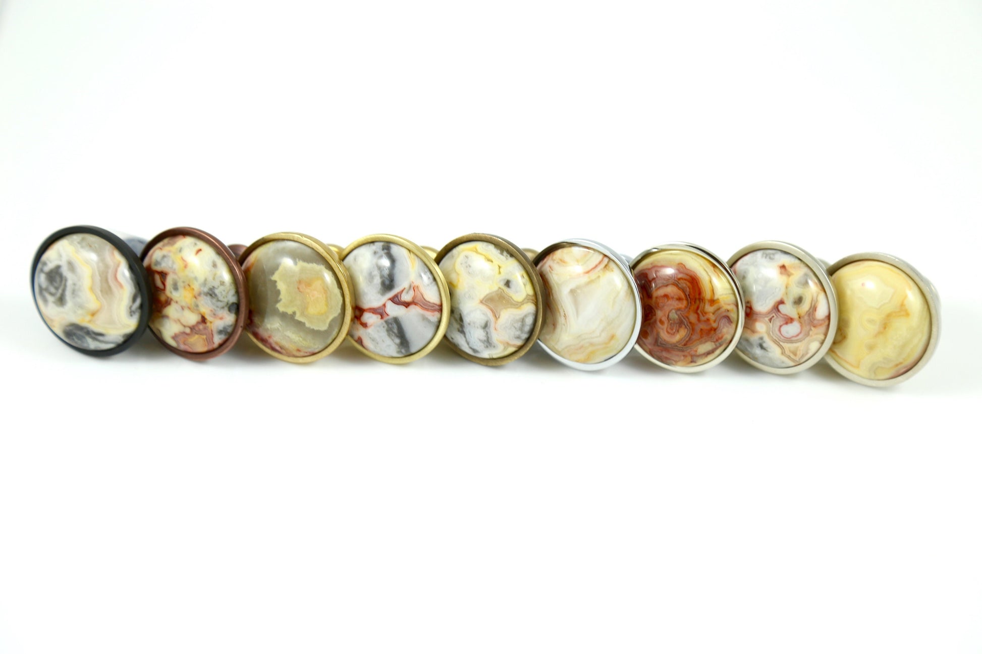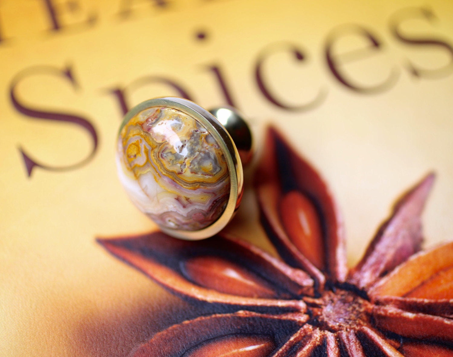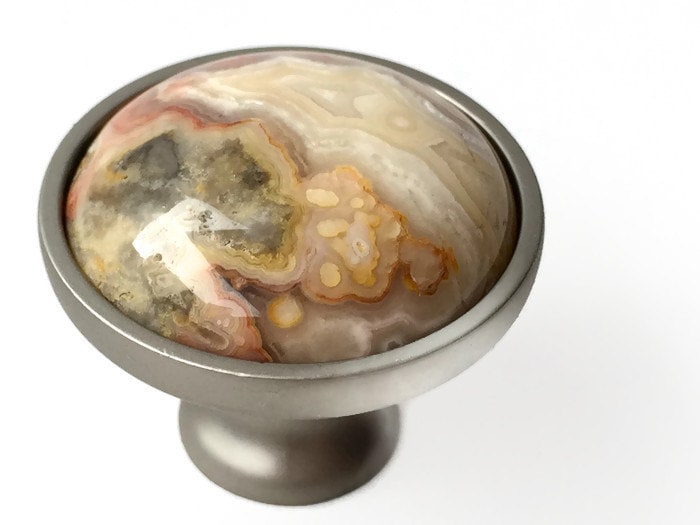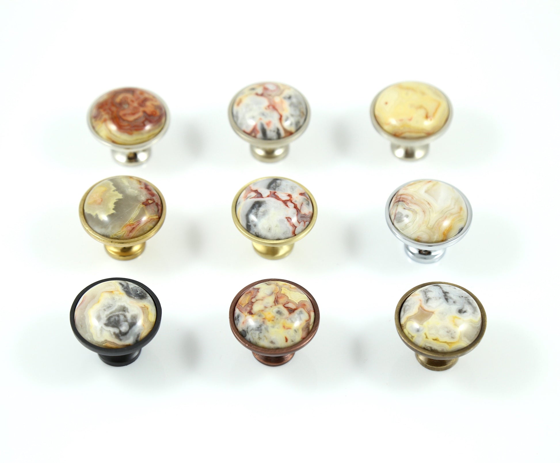 Get lost in this gorgeous stone knob with elegant swirls of earth tones. This stone is associated with warmth, happiness, laughter and dancing. Fertile Crescent Knobs will especially add elegance and warmth to your living room furniture, dresser drawers and kitchen cabinets. This listing is for one knob.