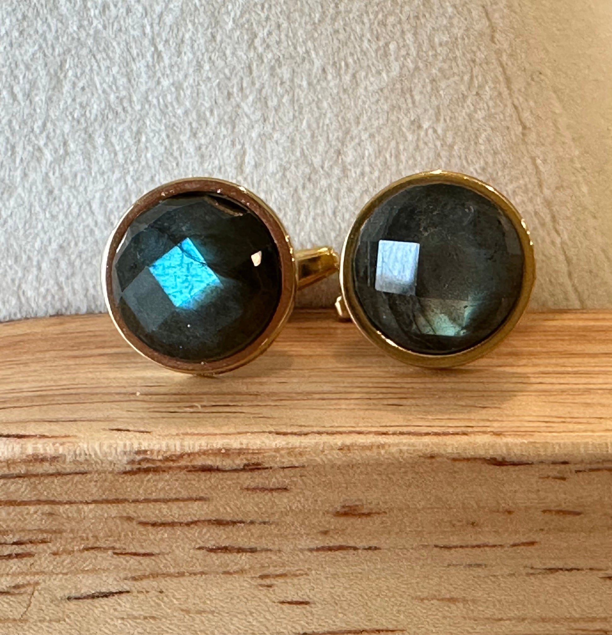 Light-reflecting facets elevate these new labradorite cufflinks! The facets in the stone maximize the brilliant blue-green hues and sparkle of the natural labradorite. These stone cufflinks are 5/8 of an inch diameter.
