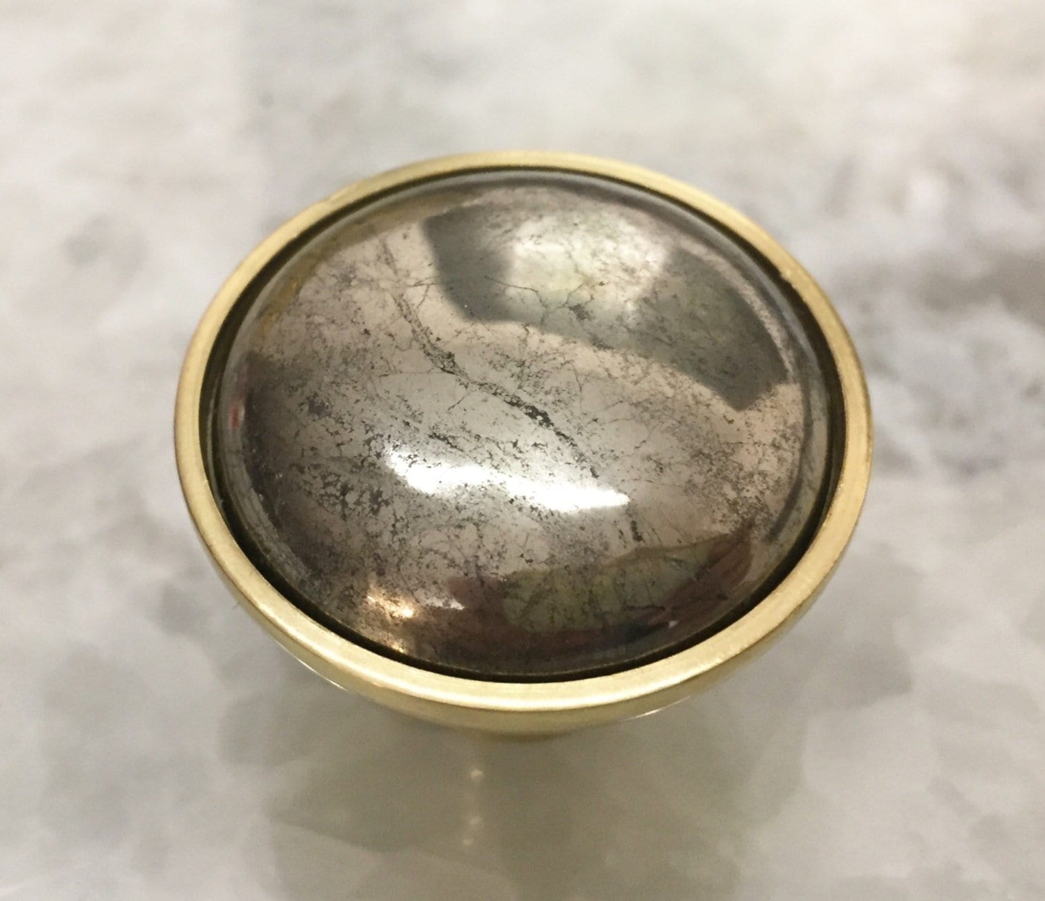 This gorgeous gold knob has a smooth, polished surface that reflects like a mirror--as if gold lava that hardened was set in an elegant low profile base. If you love the metallic look, this is the perfect home accessory for you! Each knob is custom made when to order so please choose your desired finish. Our stone knobs are unlike any other, with all finishes handmade over a base of HEAVY SOLID BRASS. You will feel the quality in the weight of the knob. The stones are professionally cut and set to last!
