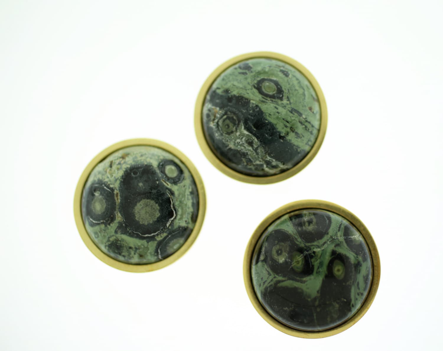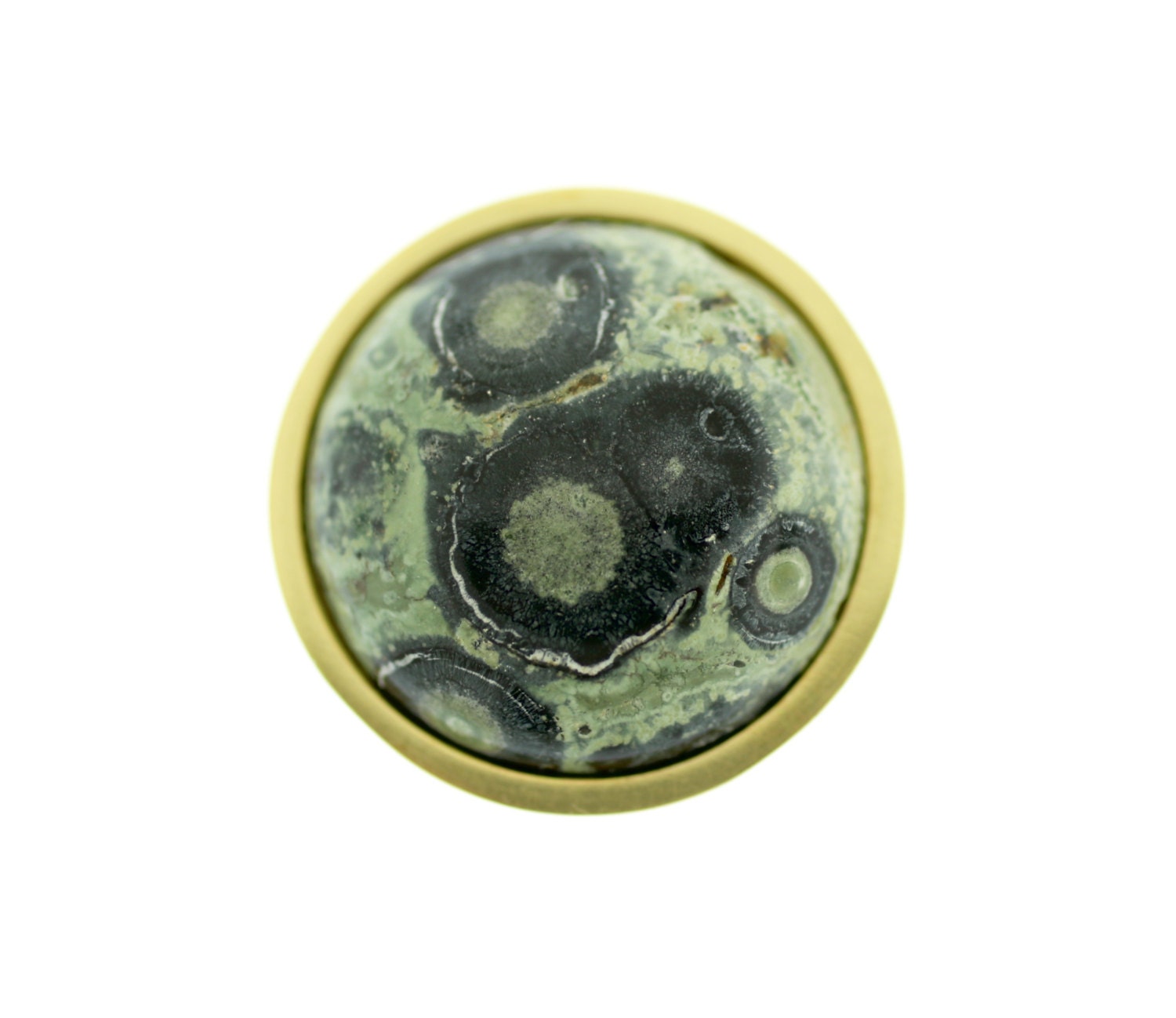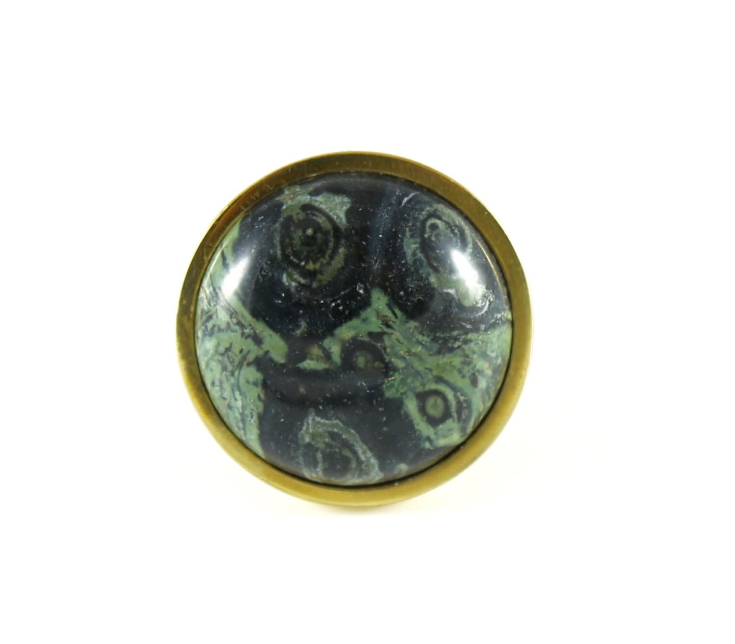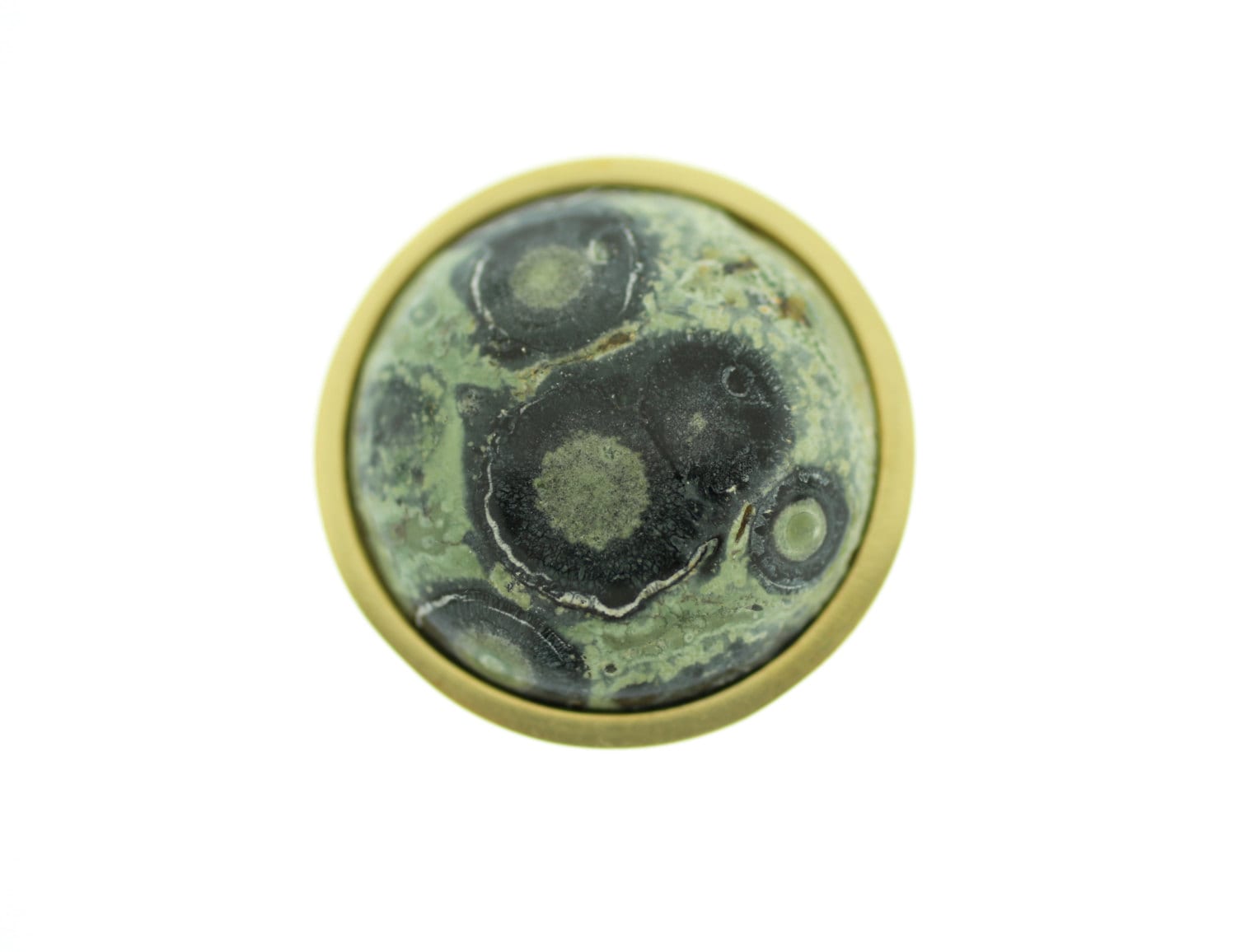 This exotic Crocodile Jasper Stone Knob is a real showstopper! Use this knob to dress up your kitchen cabinets, dresser drawers, cupboard or bathroom vanity. Our stone knobs are unlike any other, with all finishes handmade over a base of HEAVY SOLID BRASS. You will feel the quality in the weight of the knob. The stones are professionally cut and set to last.