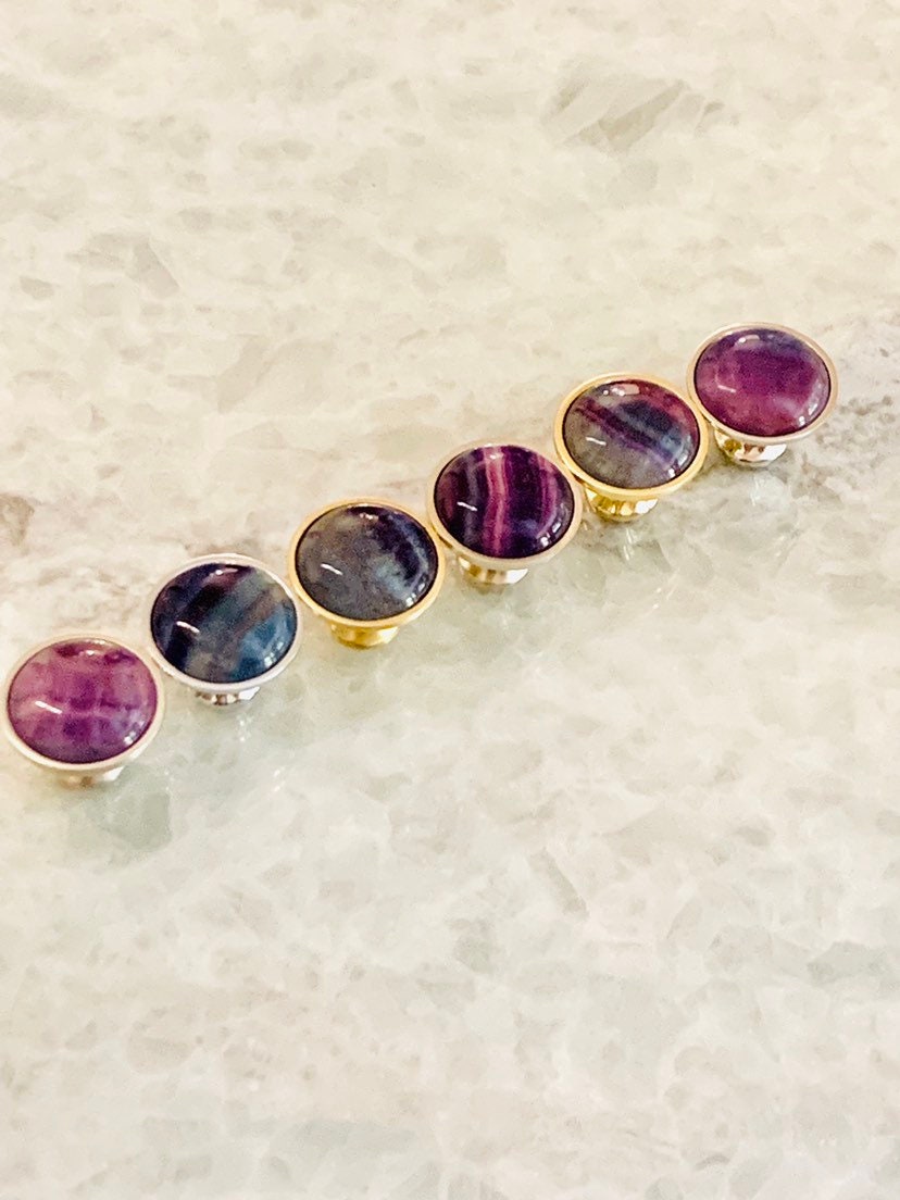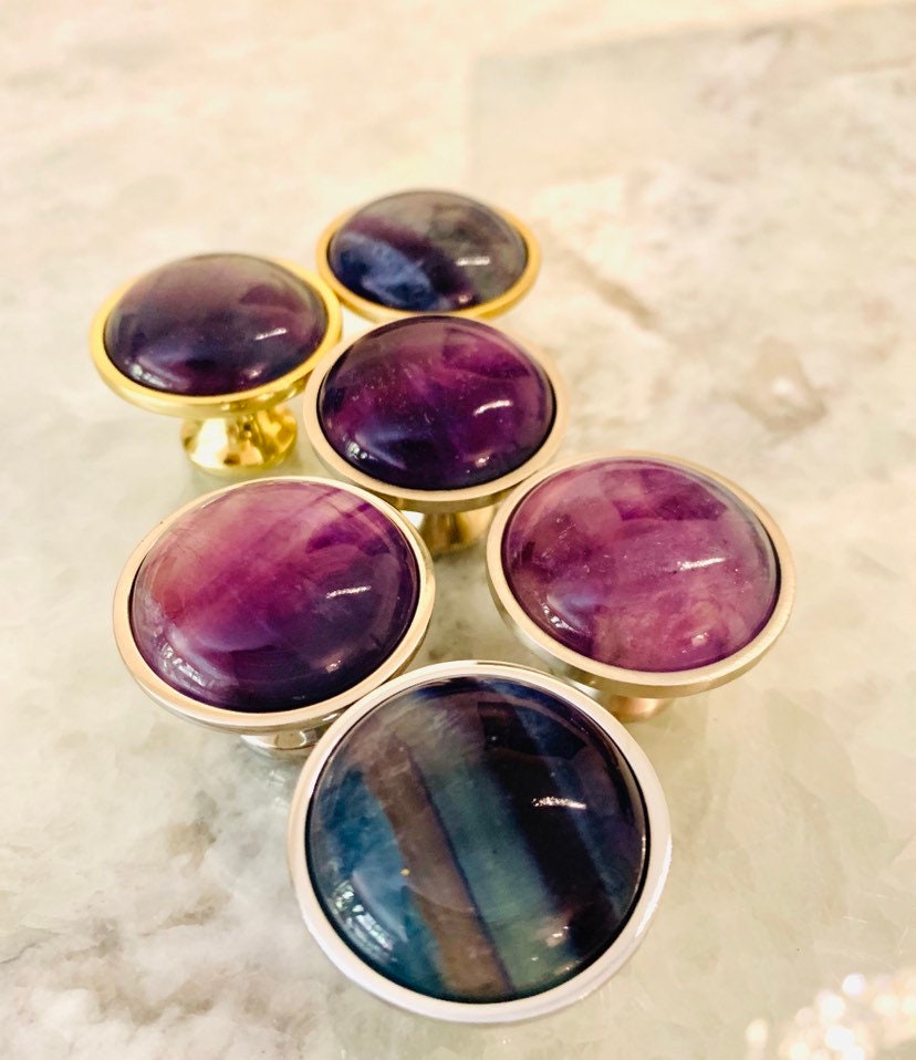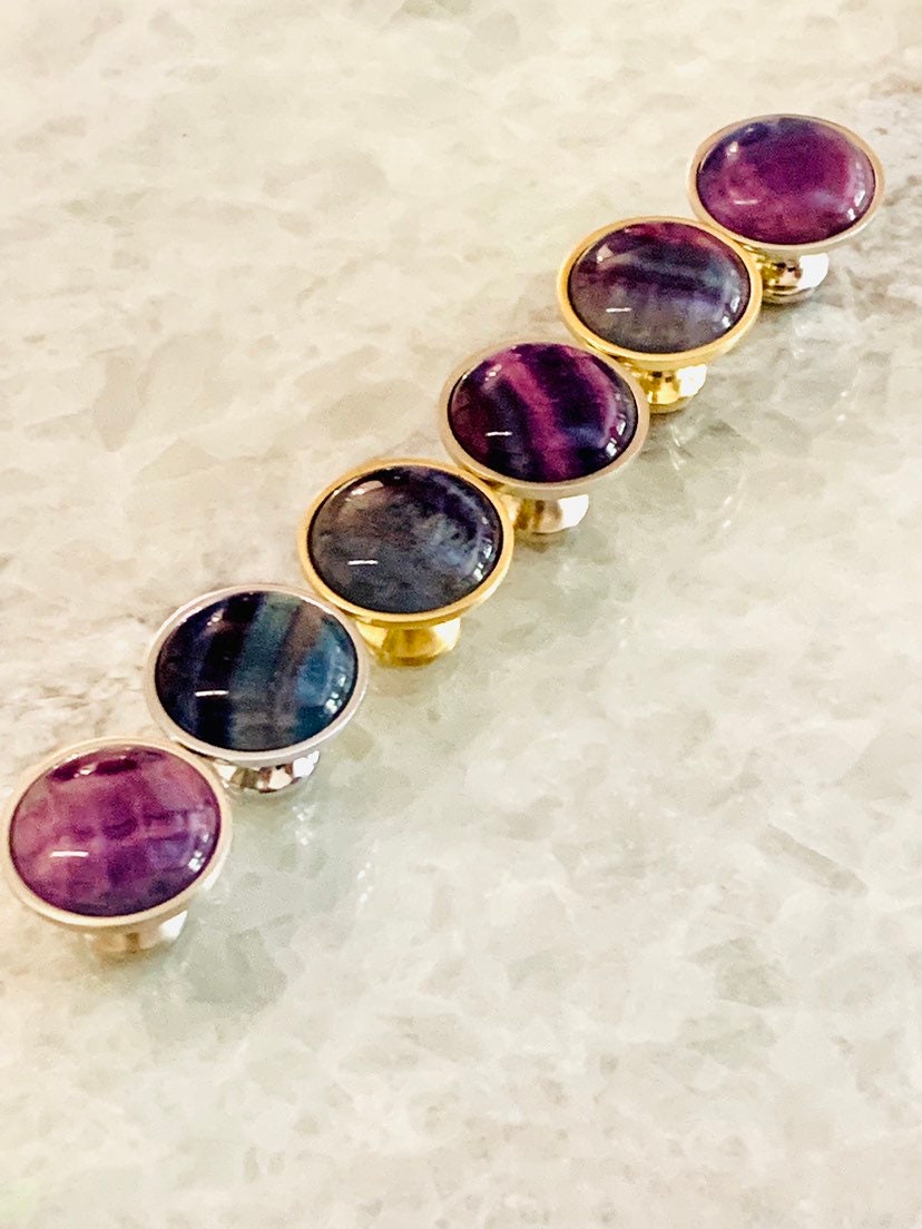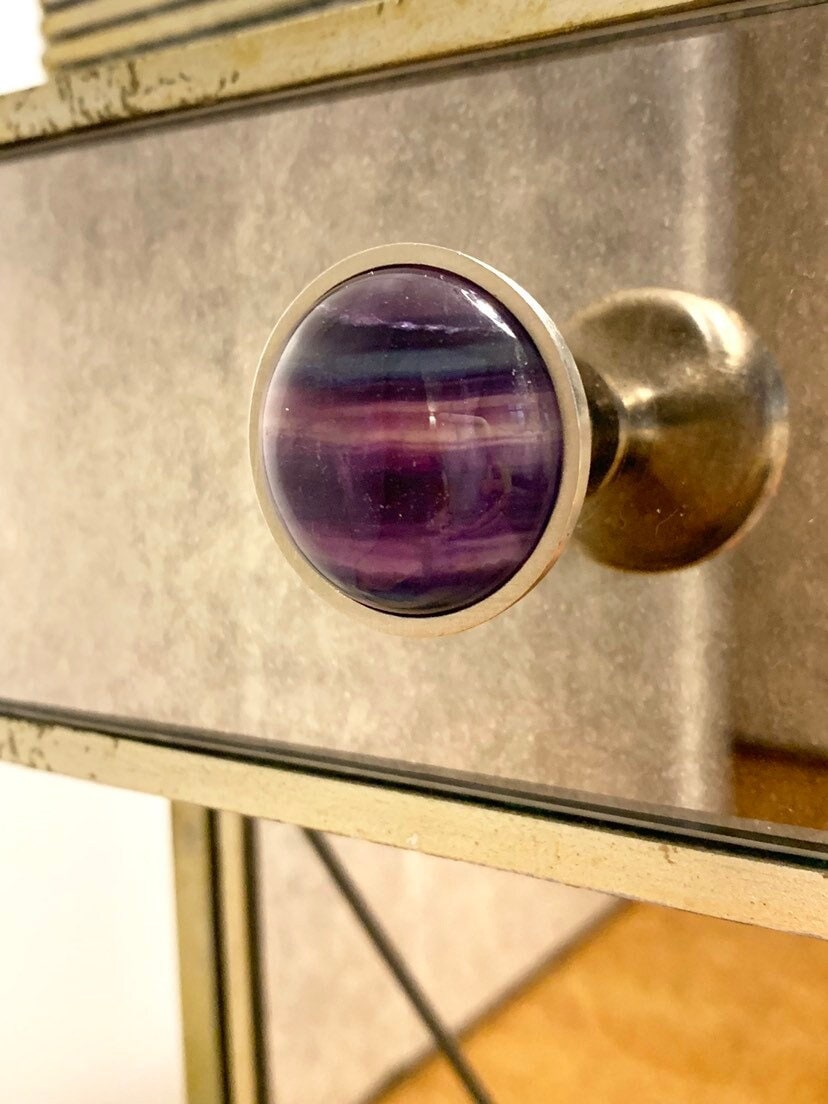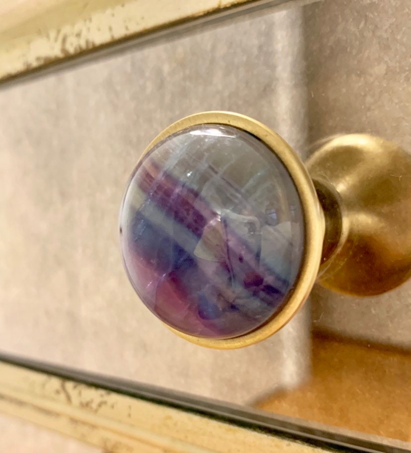 Rainbow Fluorite, with its natural array of beautiful colors, is a stone used for aura repair and energizing all the chakras. The colorful tie dye effect of this Rainbow Fluorite dresser knob will infuse your room with a hip, luxurious vibrancy. Since this knob is made from a natural stone, each one is unique and may vary in color.