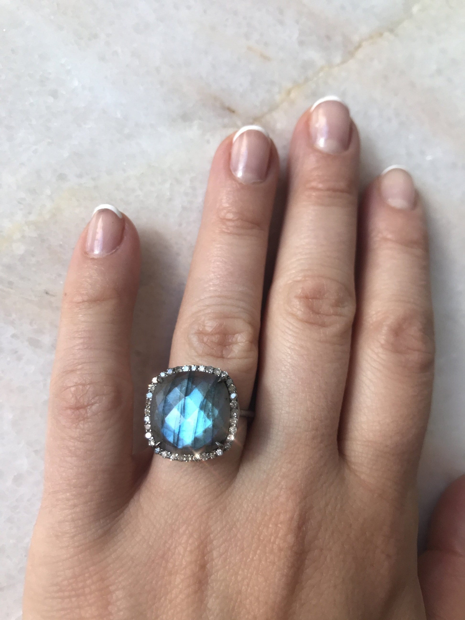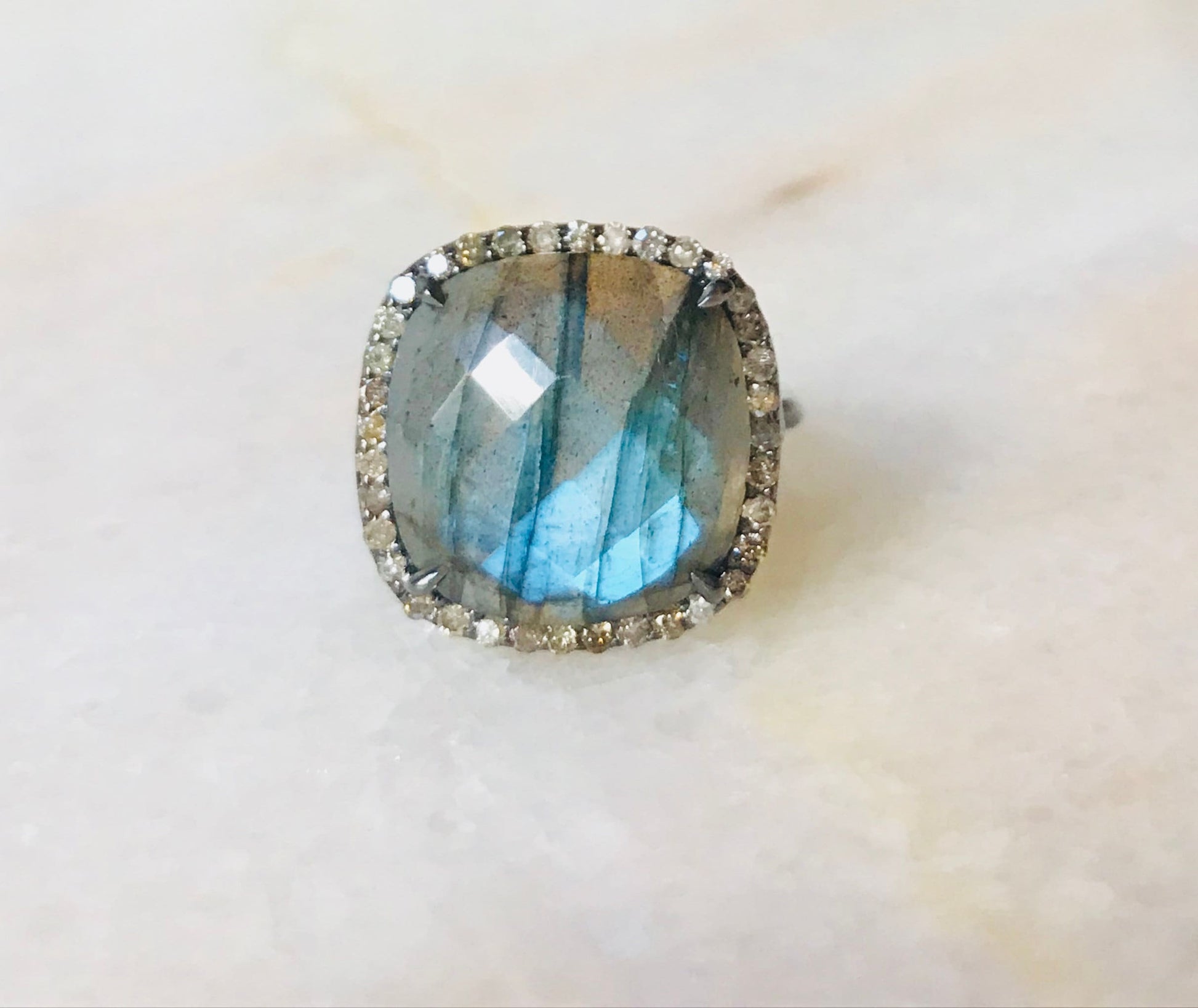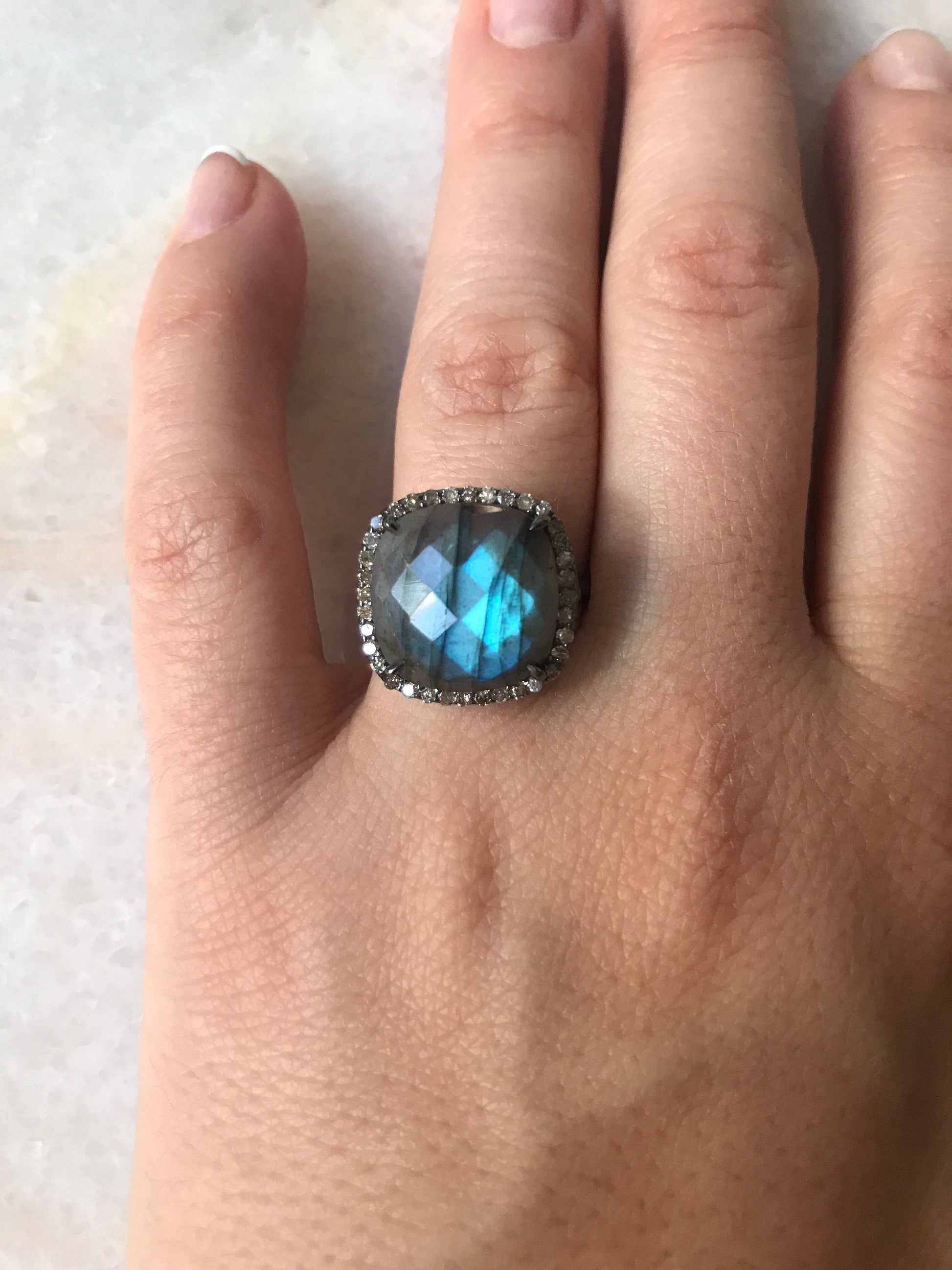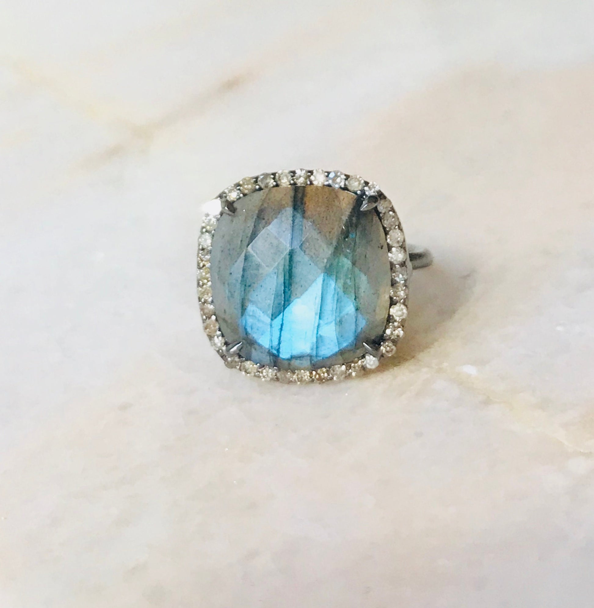 Adorn your finger with a gorgeous labradorite ring surrounded by sparkling diamonds. This gemstone ring is handcrafted with a cushion cut labradorite stone that flashes mesmerizing hues of dreamy blue. For a unique woman with elegance and a touch of mystery, this statement ring will make a special occasion unforgettable.