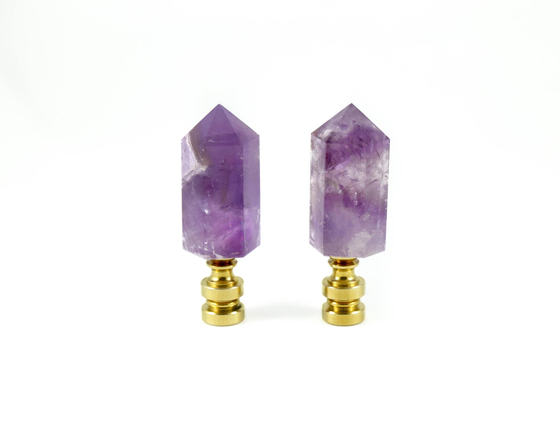 This amethyst crystal finial set is made with high quality hand-selected purple crystals. The purple quartz are set on a clean and modern brass base without prongs in order to showcase the raw stones.