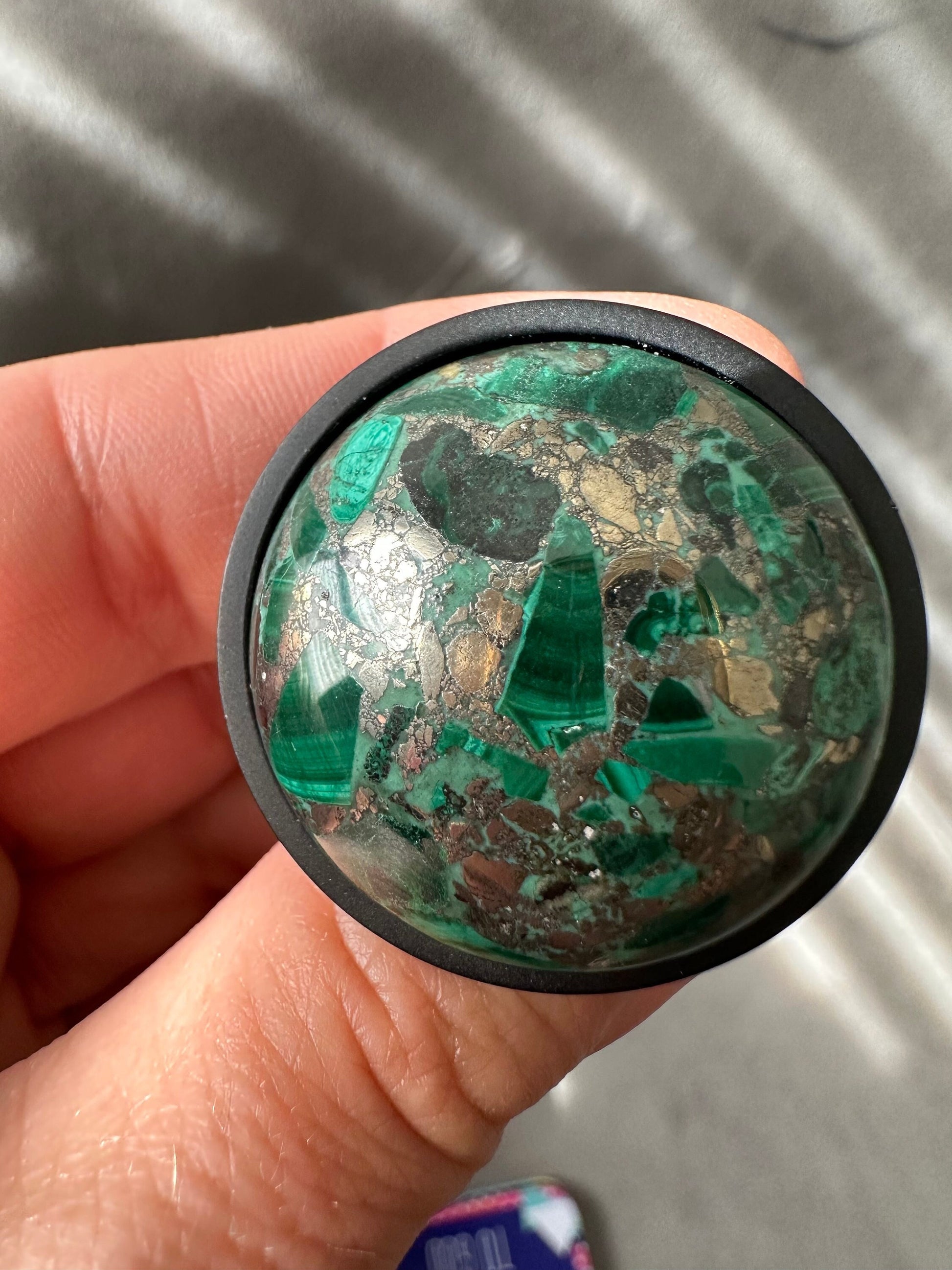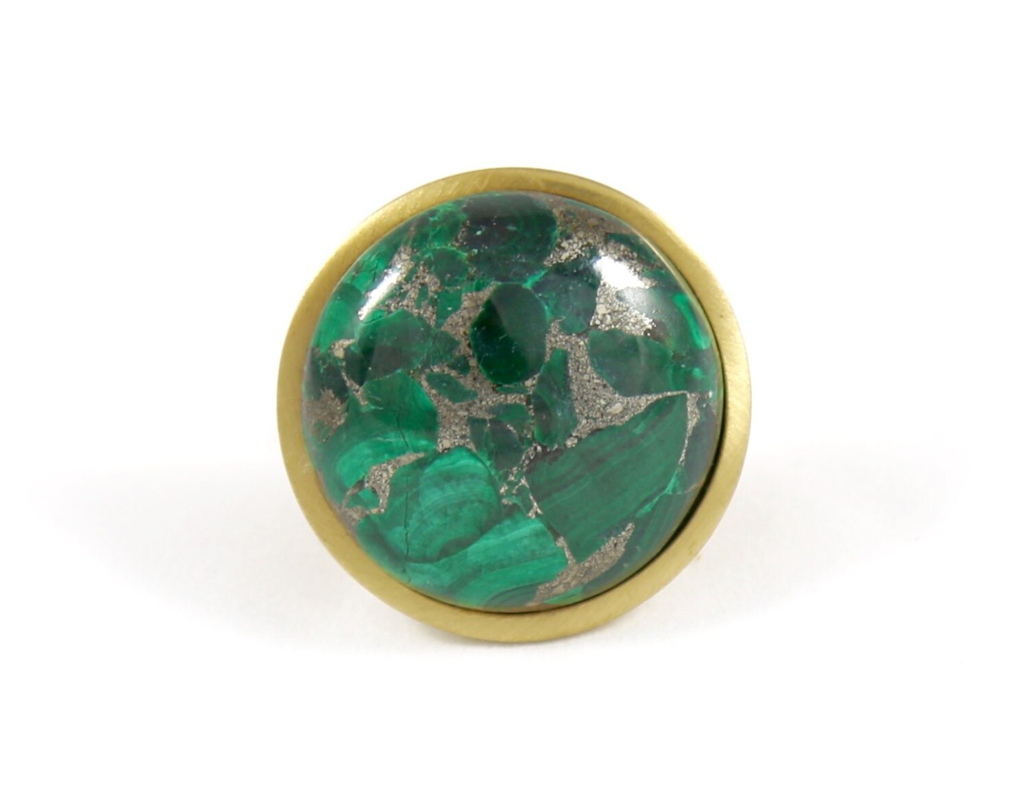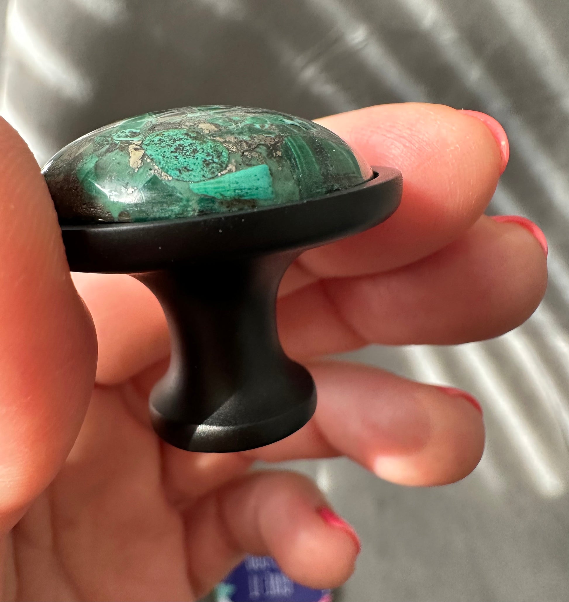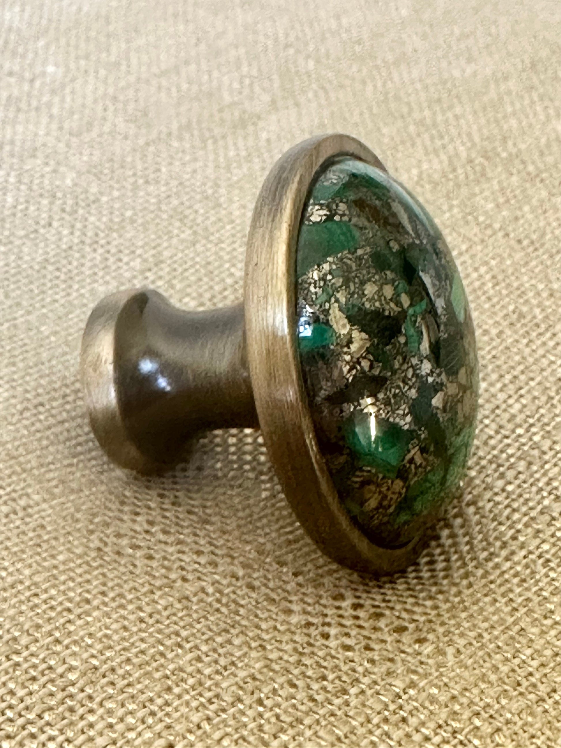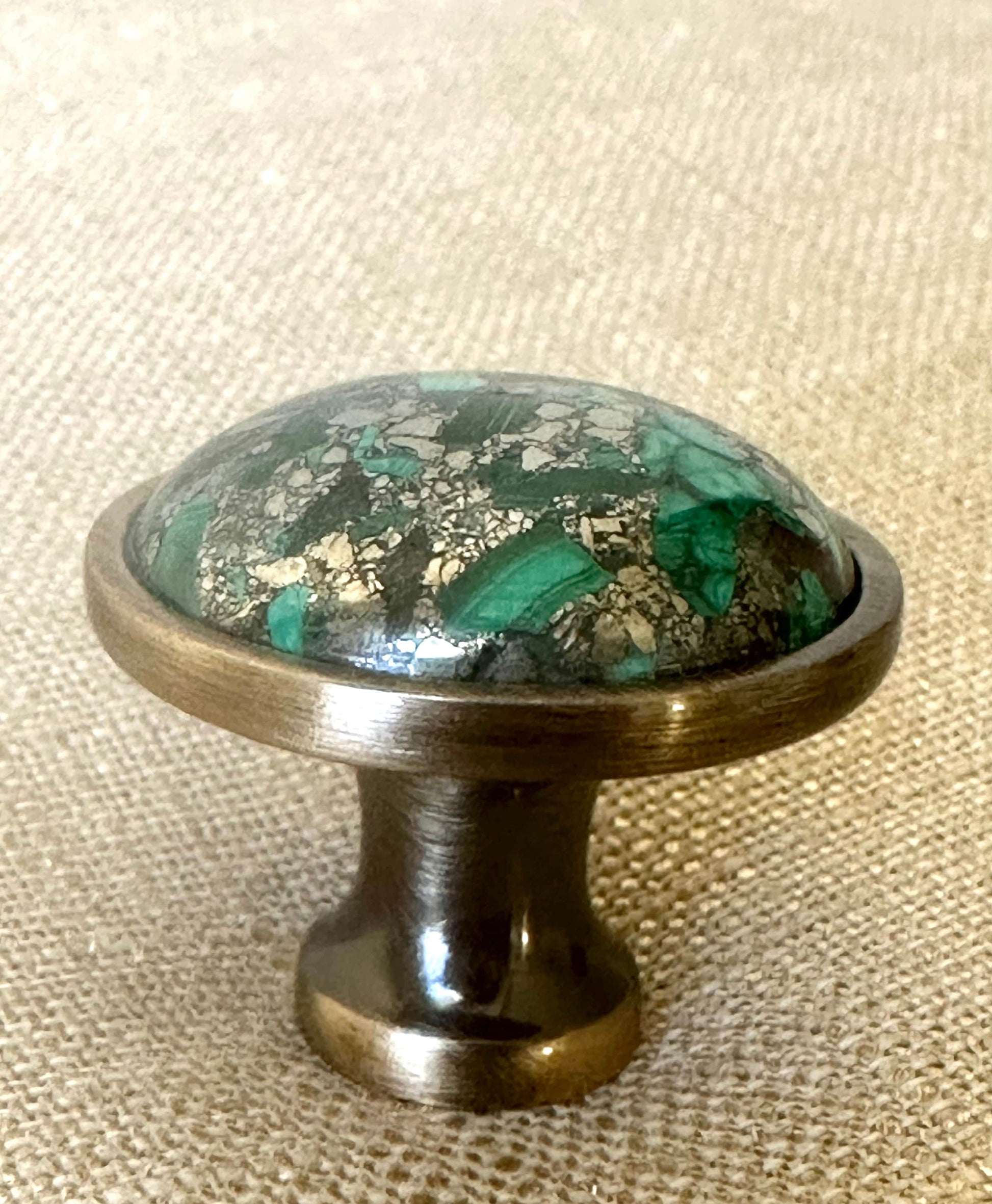 The Million Dollar Malachite Stone Knob features green malachite and gold pyrite, reminiscent of gold and dollar bills!