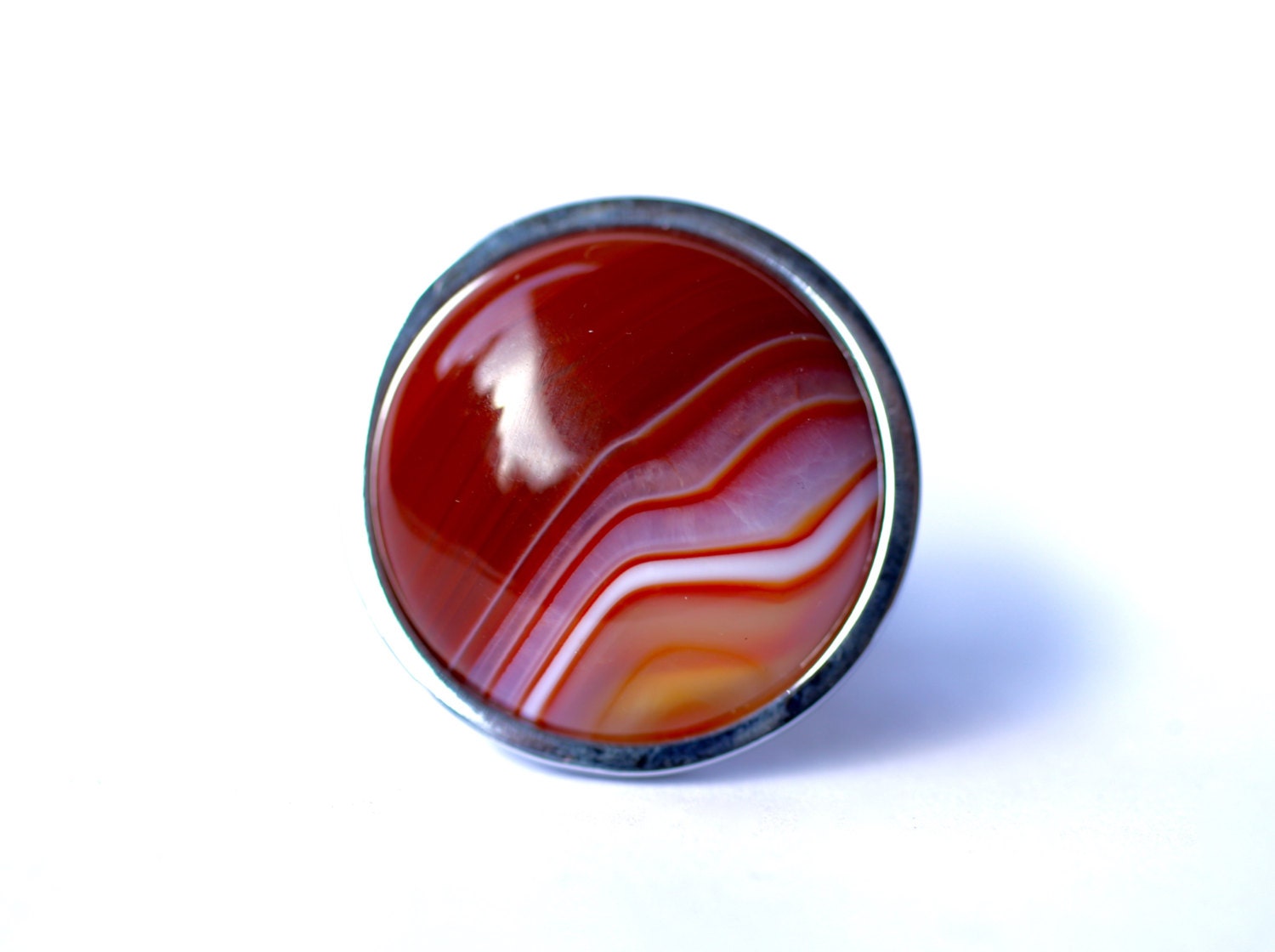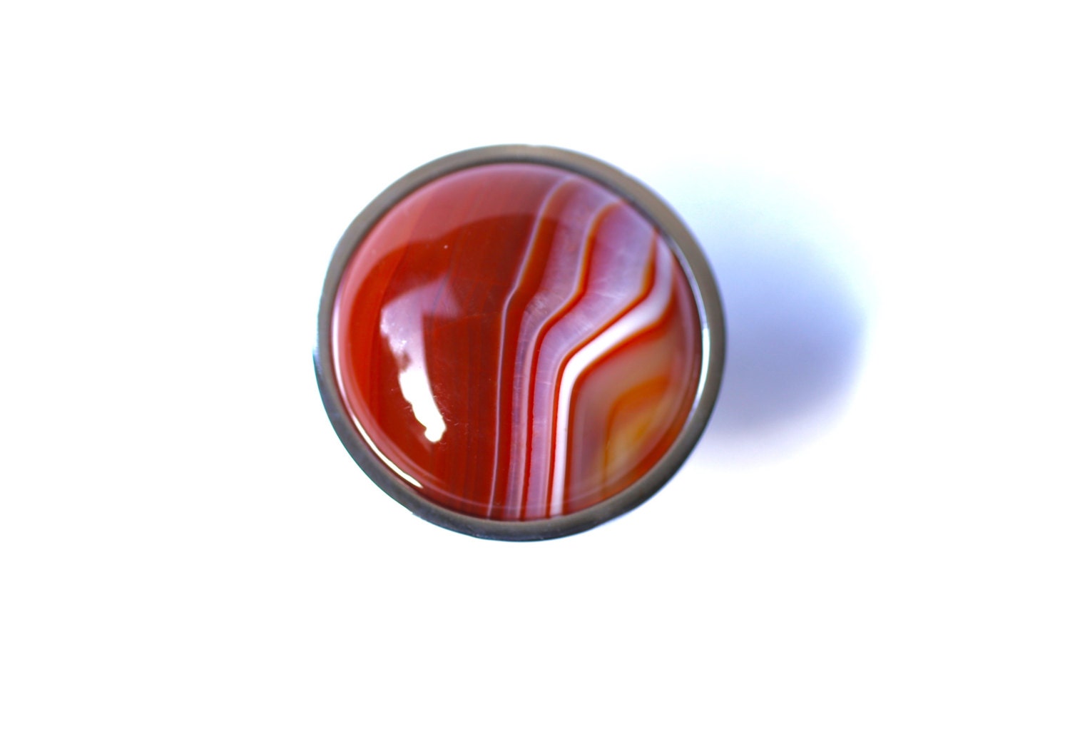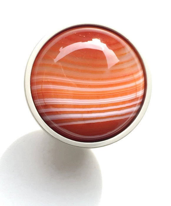 The Saturn Sunset Knob features a fiery reddish-orange and white striped agate stone.