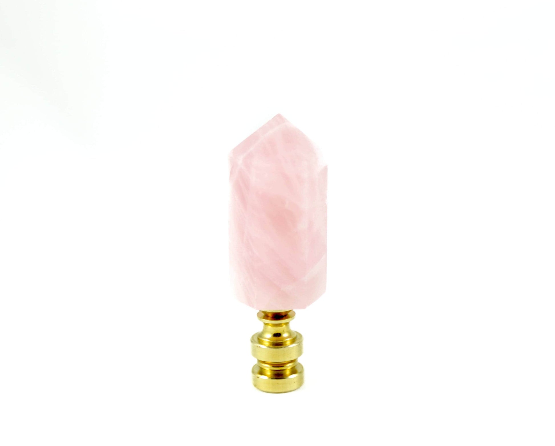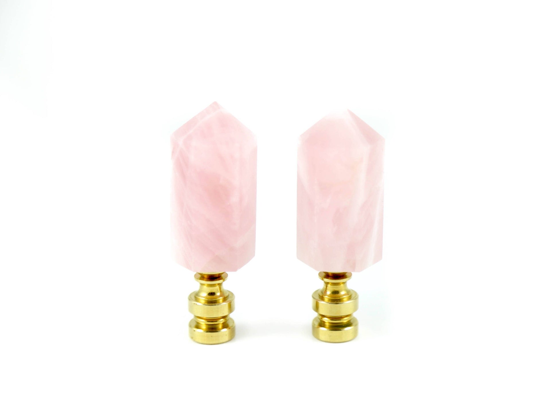 These rose quartz lamp finials are made with high quality hand-selected crystals. The pink quartz stones are set on a clean and modern brass base without prongs in order to showcase the raw stone.