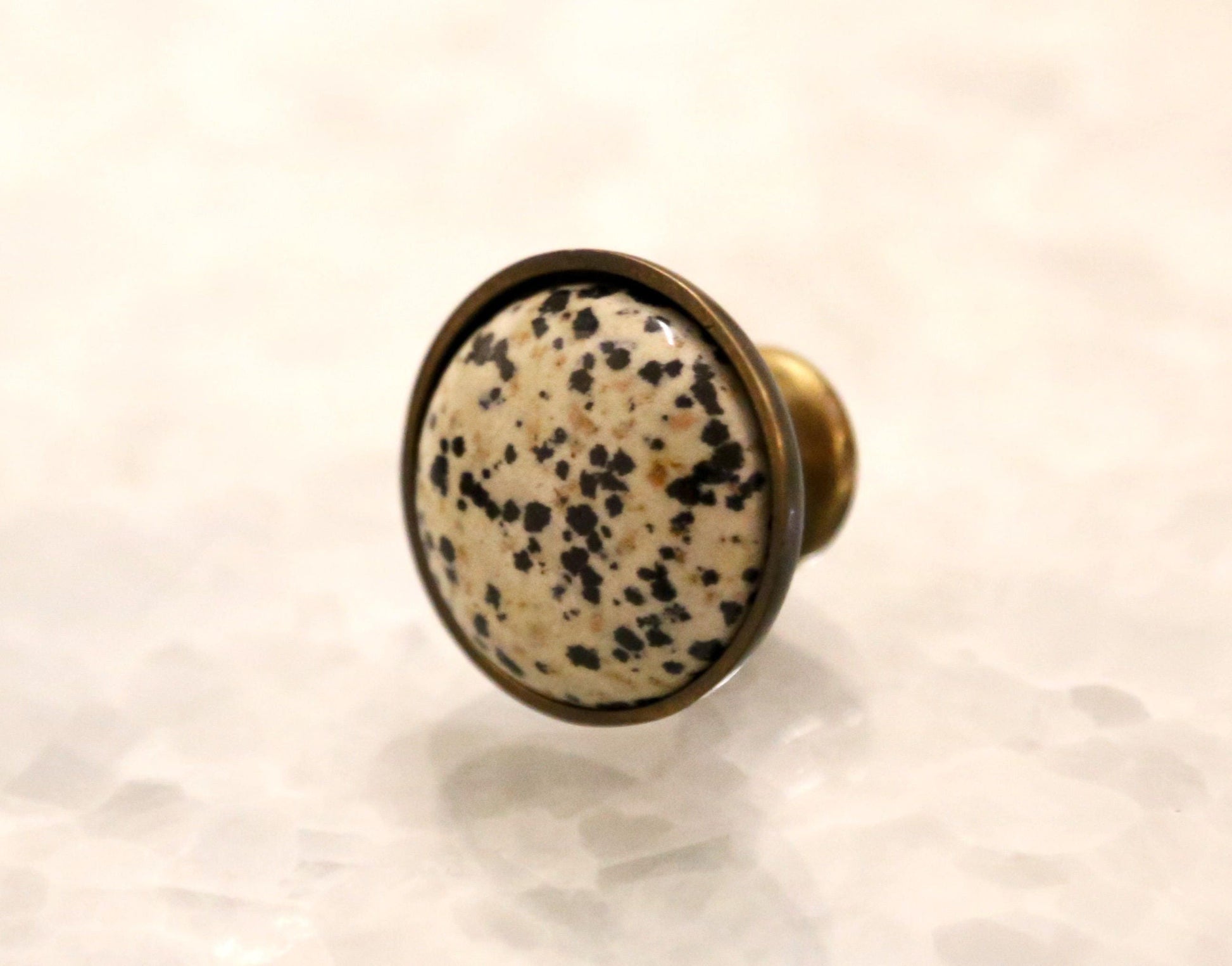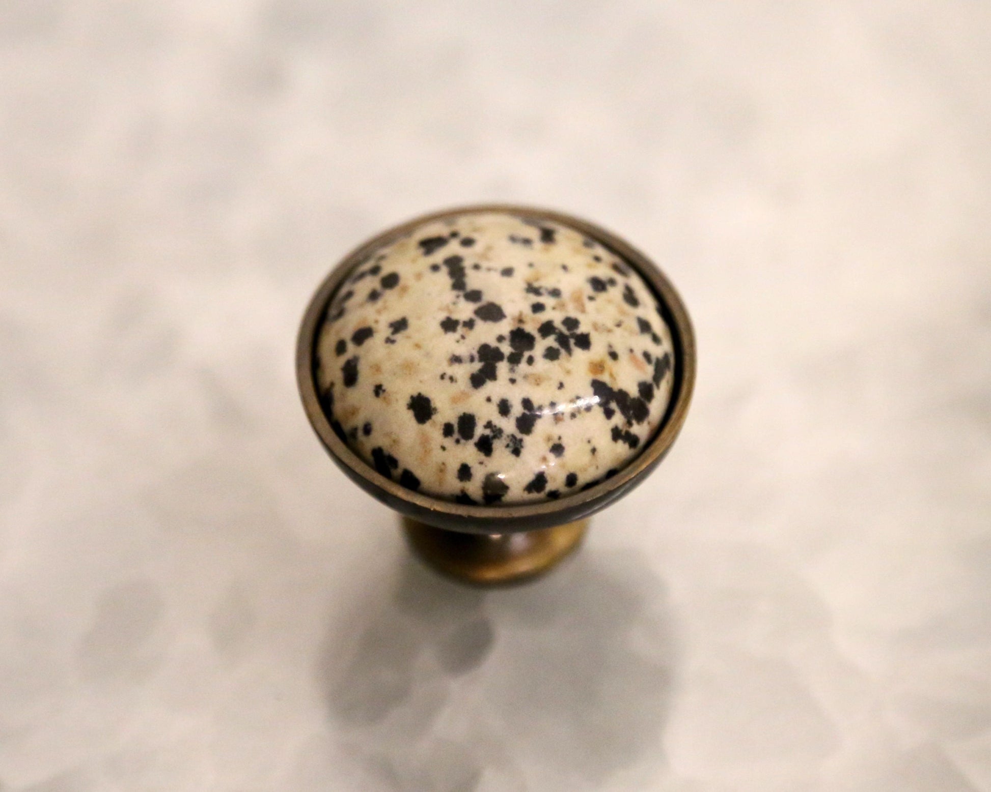 Calling all dog lovers! Dalmatian Jasper is a stone said to be successful in calming and balancing for children, pets (especially dogs), and their caretakers. Our handcrafted stone knobs are set in heavy solid brass. You will feel the quality in the weight of the knob. The stones are professionally cut and set to last.