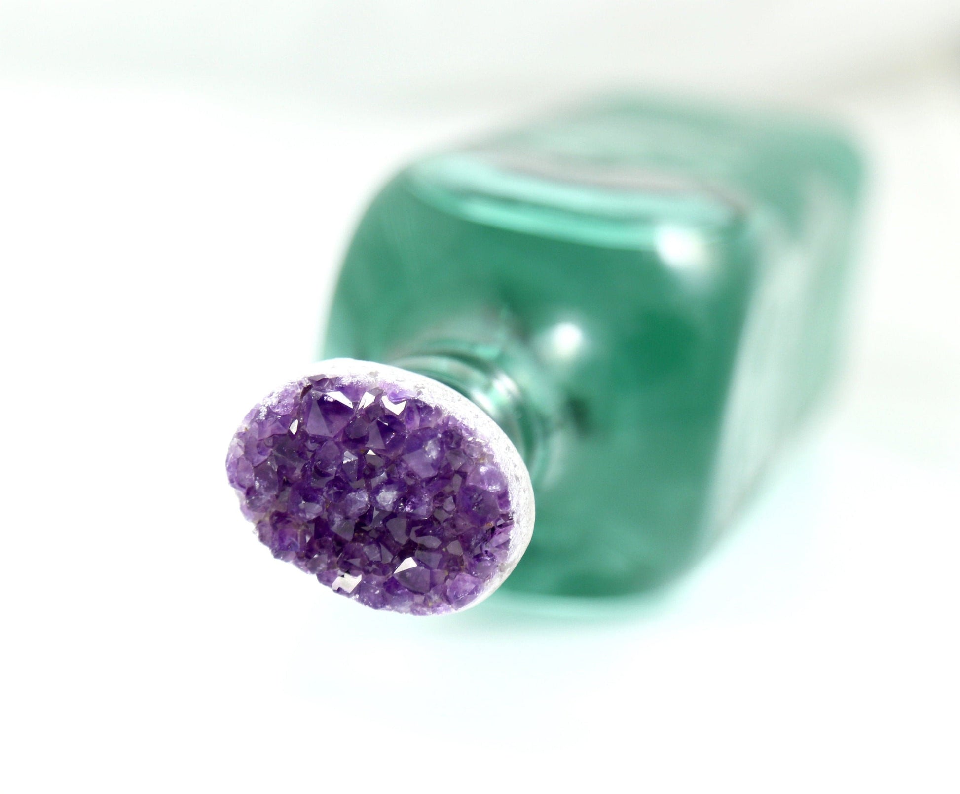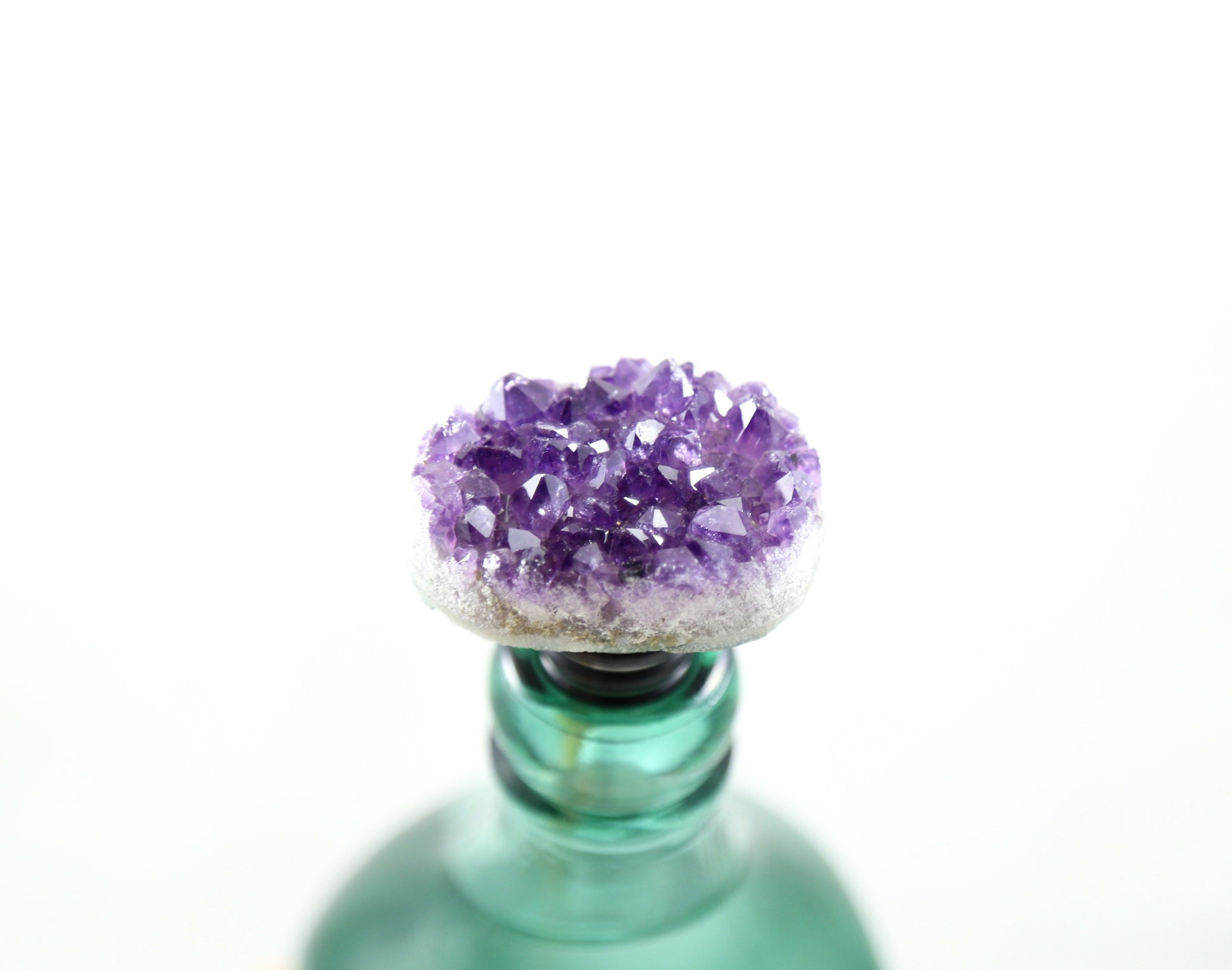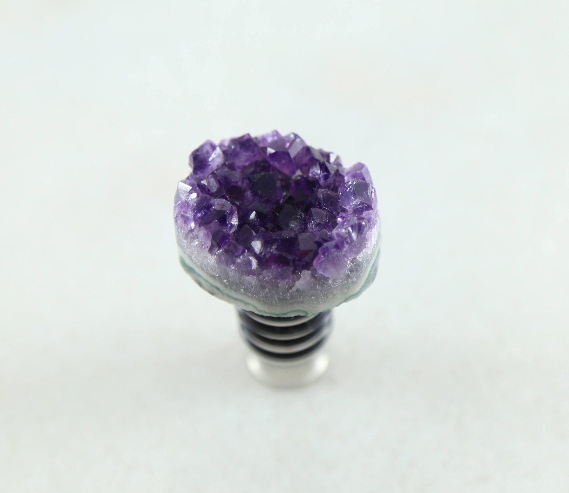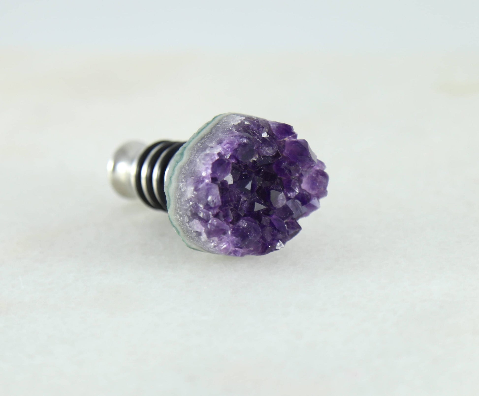 This amethyst wine stopper is crowned with a beautiful, jewelry-grade amethyst geode that is professionally cleaned with a cutting-edge polishing technique to achieve a high-end, yet natural aesthetic. Our wine stoppers have a dual purpose--they stand up on their own and double as decorations. Collect a few and display them on a shelf in your bookcase!